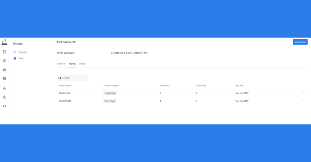 You can now create fleet teams in our fleet management system from the ConnectedFleet account settings. This feature is particularly useful to organizations with larger fleets, who would benefit from being able to divide their fleet into different teams that make sense for their business.