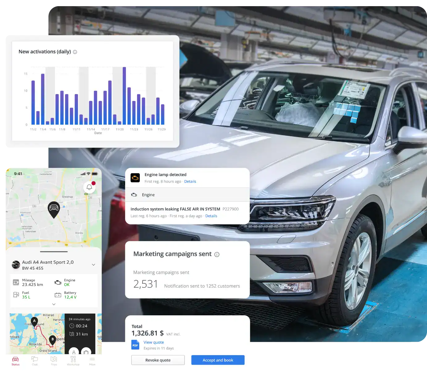 Enhance customer retention with data-driven service leads, easy communication, and convenient online booking.Retrofit hardware enabling comprehensive data access across all vehicle brands.